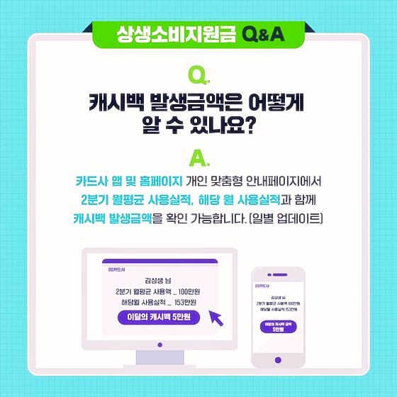 A. 카드사 앱 및 홈페이지 개인 맞춤형 안내페이지에서 2분기 월평균 사용실적, 해당 월 사용실적과 함께 캐시백 발생금액을 확인 가능합니다. (일별 업데이트)