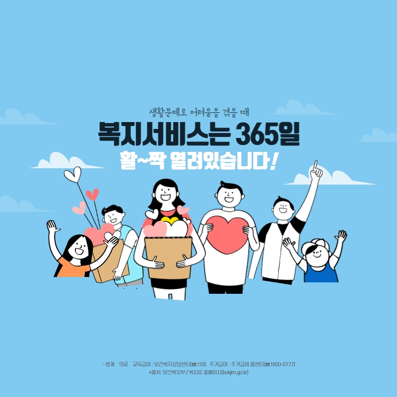 - 저소득층 : 주거급여(청년주거급여동시신청), 교육급여(교육비지원동시신청), 장제급여, 에너지바우처, 청년주거급여분리지급