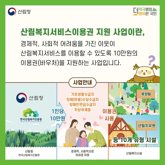 1인 10만원 산림복지서비스 이용권 지원 사업이란, 경제적, 사회적 어려움을 가진 이웃이 산림복지서비스를 이용할 수 있도록 10만원의 이용권(바우처)을 지원하는 사업입니다.