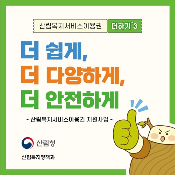 이용권 신청 시, 수급자임을 증명하는 서류 등을 첨부해야 하는 절차를 간소화하여 산림복지서비스 이용권 신청이 한결 수월해졌습니다.