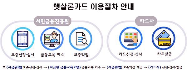 햇살론카드 발급 문의 신청 방법은 서금원 앱을 통해 보증신청, 심사를 거쳐 보증승인된 경우 서금원 금융교육포털에서 햇살론카드 필수교육 이수, 이후 서금원 앱에서 보증약정 체결 후 7개 카드사에 카드신청·발급이 가능하다.