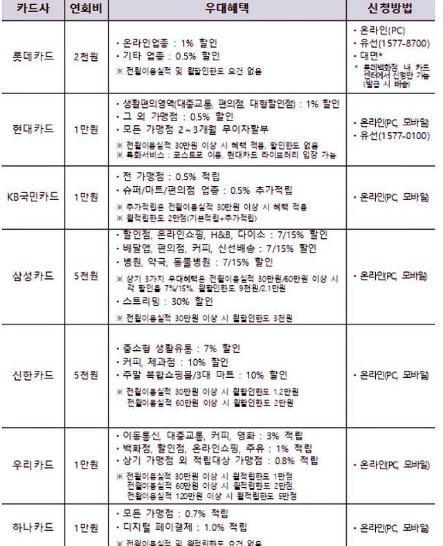 (카드신청) 7개 신용카드사*에서 신청 가능(“협약카드사 발급신청 안내” 탭의 카드사별 링크로 신청가능)