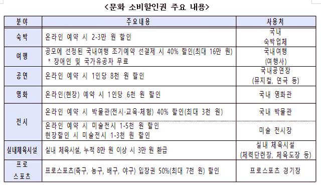 공연 분야에서는 인터파크, 예스24 등 8개 온라인 예매처를 통해 공연 예매 시 사용할 수 있는 8000원 할인권을 제공한다. 지난 5월 18일부터 네이버티브이(TV) 등에서 온라인 공연 관람 시 적용했던 1인당 8000원 할인권도 계속 지원한다. 대면 공연과 온라인 공연을 통합해 1인당 2주마다 최대 3만 2000원(8000원 할인권×1인당 4매)을 할인받을 수 있다.
