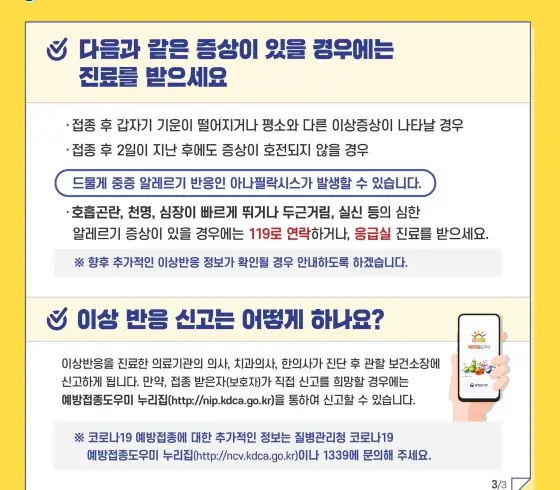 - 접종 후 2일이 지난 후에도 증상이 호전되지 않을 경우 드물게 중증 알레르기 반응인 아낙필락시스가 발생할 수 있습니다.