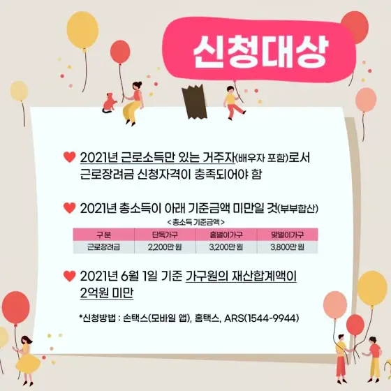 → 2021년 근로소득만 있는 거주자(배우자 포함)로서 근로장려금 신청자격이 충족되어야 함
