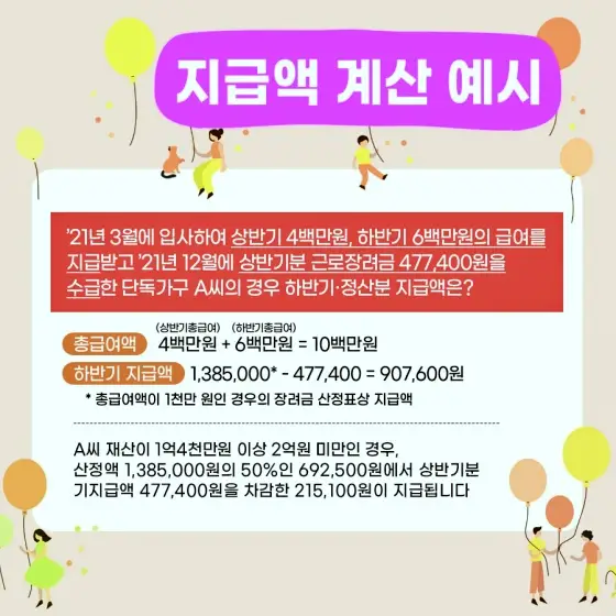 Q. ’21년 3월에 입사하여 상반기 4백만 원, 하반기 6백만 원의 급여를 지급받고 ’21년 12월에 상반기분 근로장려금 477,400원을 수급한 단독가구 A씨의 경우, 하반기·정산분 지급액은?