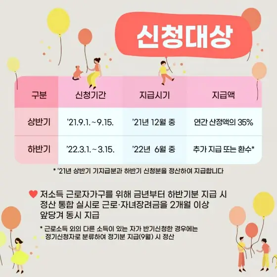 → 저소득 근로자 가구를 위해 금년부터 하반기분 지급 시 정산 통합 실시로 근로·자녀장려금을 2개월 이상 앞당겨 동시 지급