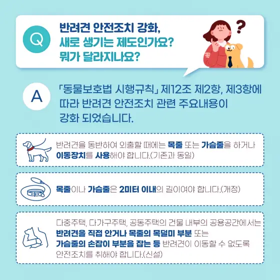 - (기존과 동일) 반려견을 동반하여 외출할 때에는 목줄 또는 가슴줄을 하거나 이동장치를 사용해야 합니다.