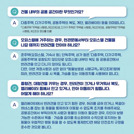 오피스텔에 거주하는 경우, 현관문에서부터 오피스텔 건물을 나갈 때까지 반려견을 안아야할지 궁금할텐데 준주택(오피스텔, 기숙사 등), 단독주택, 상가 등은 ‘다중주택, 다가구주택, 공동주택’에 포함되지 않으므로 오피스텔 내부의 복도 등 공용공간에서 반려견을 안고 다니지 않아도 됩니다. 다만, 이번 개정사항과 상관없이 「동물보호법 시행규칙」 제12조제1항에 따라, 반려견과 외출 시 목줄, 가슴줄 또는 이동장치를 사용해야 합니다.
