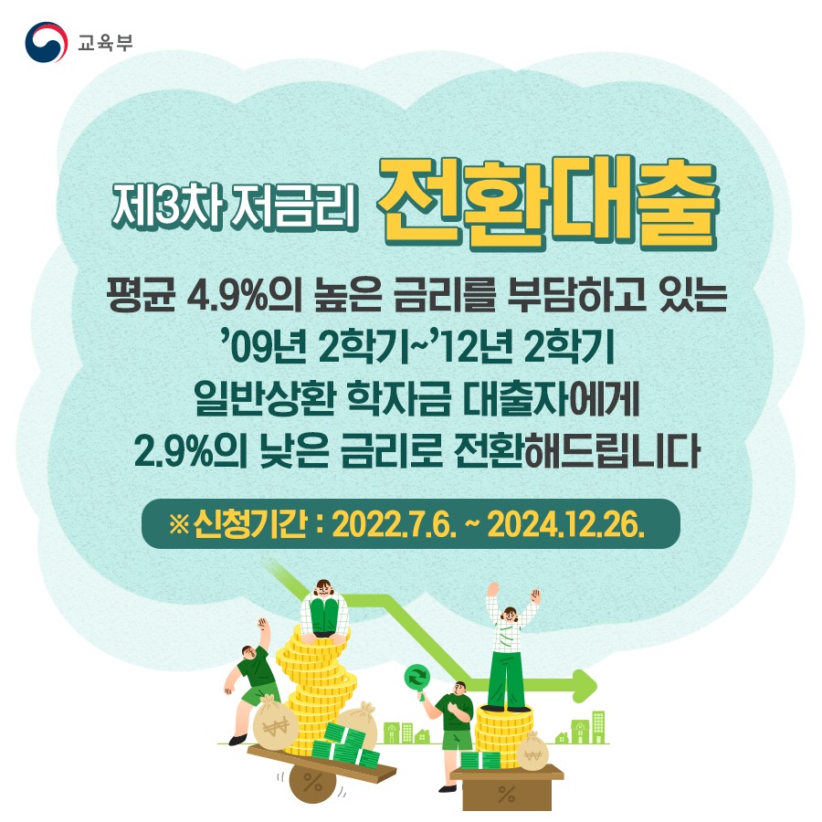 평균 4.9%의 높은 금리를 부담하고 있는 ’09년 2학기~ ’12년 2학기 일반상환 학자금 대출자에게 2.9%의 낮은 금리로 전환해 드립니다.