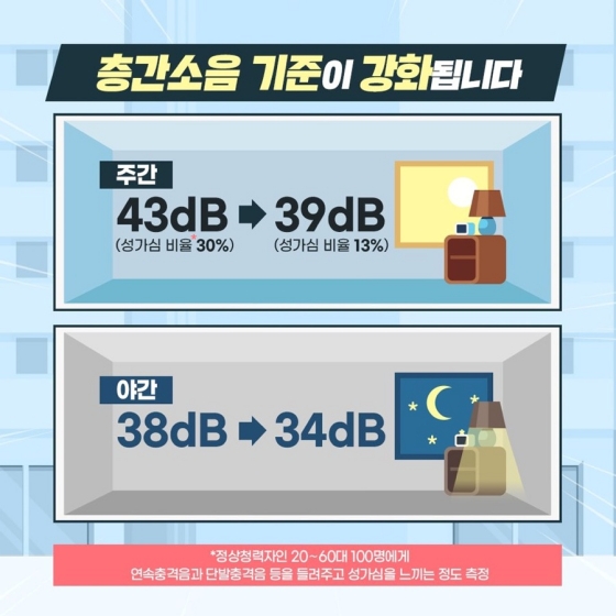 일상생활 및 소음에 대한 불편을 줄일 수 있도록 층간소음 기준을 강화합니다. 또한, 층간소음으로 인한 갈등을 줄일 수 있는 실질적인 대책 마련과 지원체계를 구축하는 등 국민 불편해소를 위하여 더욱 노력하겠습니다!