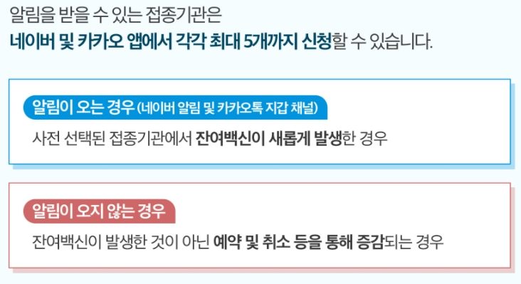 그동안 잔여백신은 1차접종만 예약 및 접종이 가능했으나 오는 17일부터 네이버 혹은 카카오 앱을 통한 당일신속 잔여백신 예약 서비스로 2차 접종도 가능해진다. 또한 의료기관에 개별 연락해 접종 예약 명단으로 올리는 방식인 의료기관별 예비명단으로도 가능한데, 앞으로는 1차 접종을 한 의료기관에서 등록한 잔여 백신만 가능하던 방식에서 잔여백신이 있는 모든 의료기관으로 넓어진다.