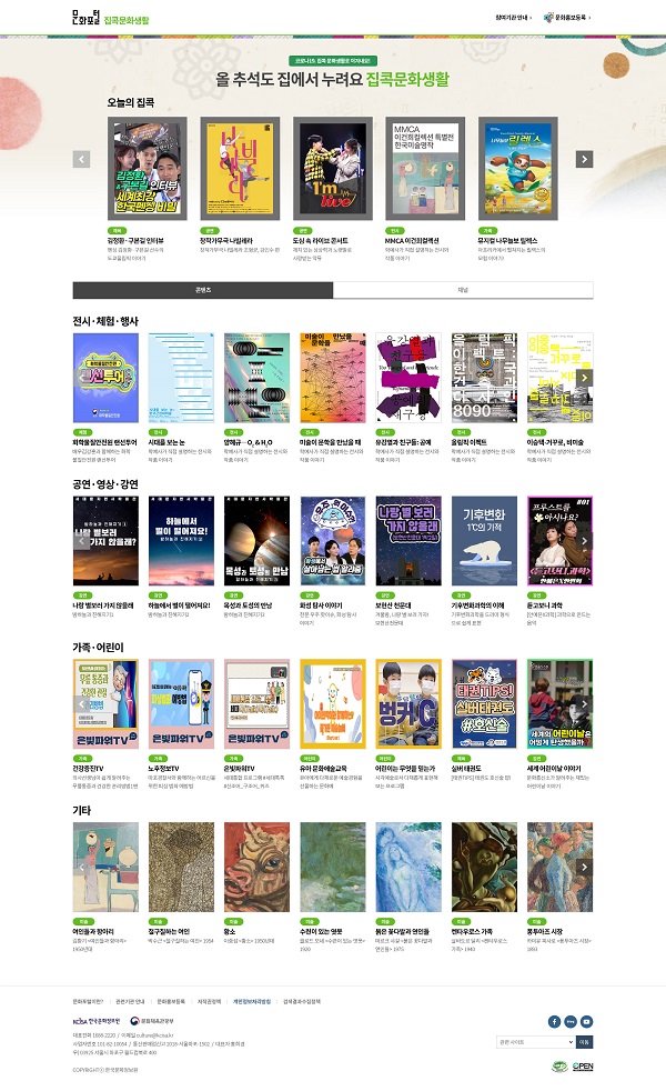 문화체육관광부는 17일 한국문화정보원과 함께 이날부터 오는 26일까지 추석 연휴 기간 집에서 즐길 수 있는 국공립 문화예술기관의 비대면 공연·전시·행사 등을 통합해 안내하는 누리집 ‘집콕 문화생활 추석 특별전’을 운영한다고 밝혔다. 문체부는 지난해 3월부터 국립·공공기관이 보유한 비대면 문화예술 콘텐츠를 국민 누구나 쉽고 편하게 즐길 수 있도록 ‘집콕 문화생활' 홈페이지에서 통합 안내하고 있으며, 추석·설과 연말연시, 가정의 달 등 연휴 기간마다 특별전을 운영해 왔다.